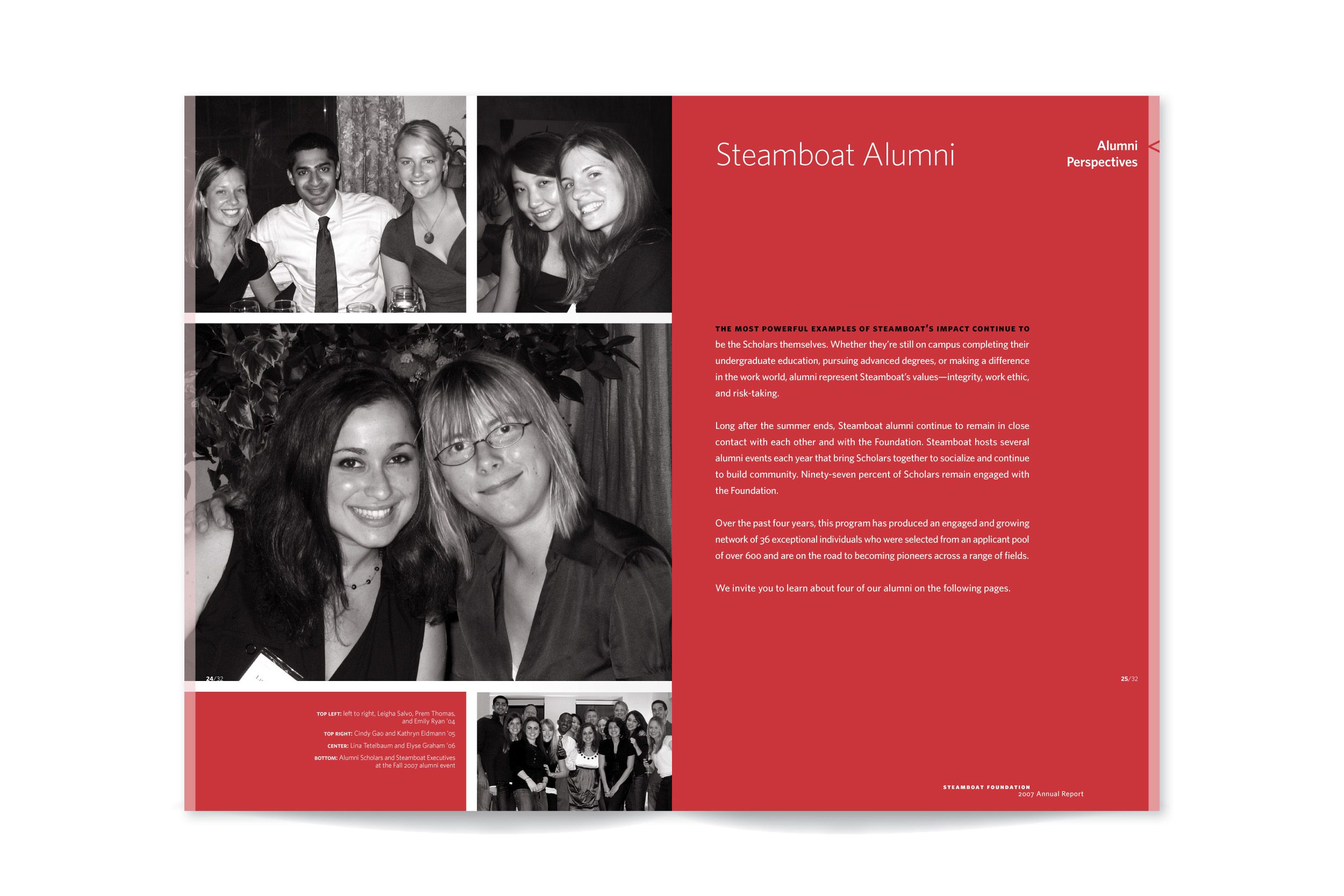 Steamboat Foundation invests in exceptional individuals who show the promise to become engaged leaders and pioneers across a range of professional fields. The Summer Scholar Program offers selected scholars an exceptional opportunity to work with industry leaders including one Nobel Laureate. Used as a tool to recruit scholars and solicit financial support, this annual review highlights the scholars, their background and their respective growth from the Steamboat experience.
